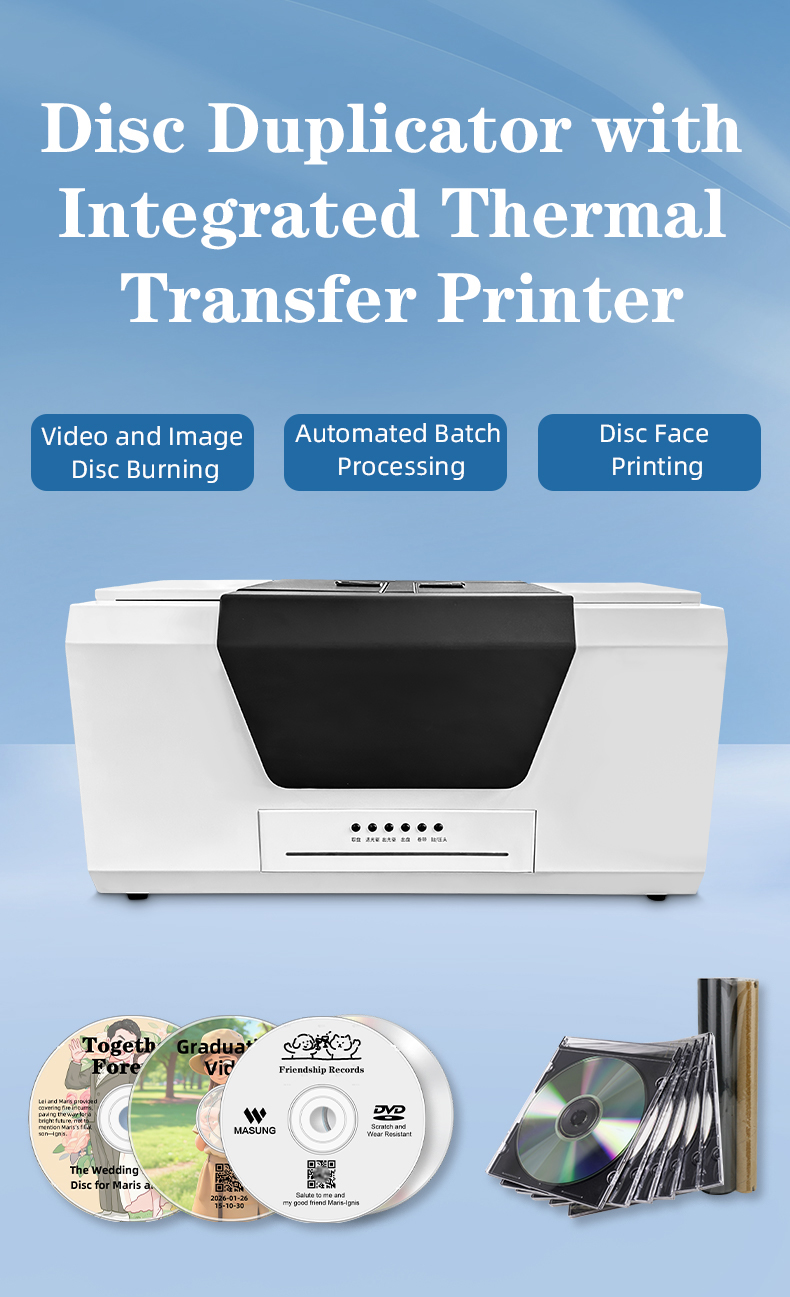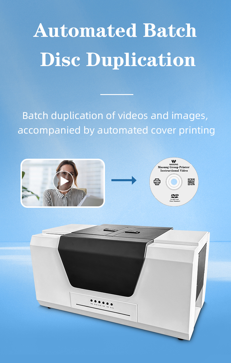 The Masung MS-550A is a fully integrated CD duplicator and printer engineered for efficiency. This standalone CD/DVD duplicator combines a high-performance CD/DVD recorder duplicator with a built-in DVD disc printer in one robust unit. Its automatic disc handling system manages the entire workflow for 100 CD duplications, from burning to printing and sorting, making it a complete CD disk duplicator solution for unattended, bulk replication tasks.