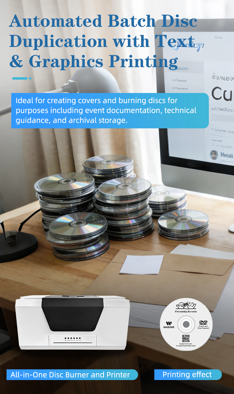 Functioning as a versatile CD burner duplicator and CD/DVD duplicator, the MS-550A features a high-performance optical drive compatible with Blu-ray, DVD, and CD formats. It supports fast burning speeds (e.g., 24X for CD-R), enabling it to act as a high-speed CD/DVD duplicator for efficient batch recording alongside simultaneous disc surface printing.