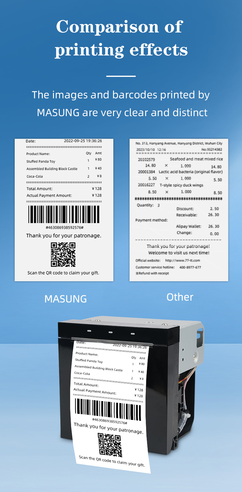 The MASUNG MS-FPT305 is a high-performance kiosk thermal printer module engineered for seamless and versatile integration. Its compact form factor and support for adjustable 58 mm and 80 mm paper widths make it an ideal fit for a wide range of space-constrained environments.